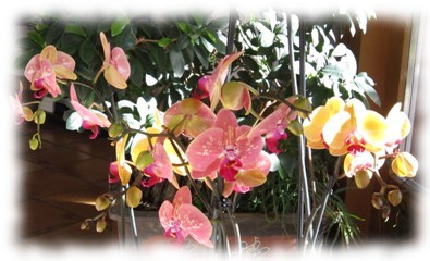 Die Farben dieser Orchideen rufen nach hellem und dunkleren Grün und stehen dazu in reizvollem Kontrast. Ihr Schmelzpunkt mündet in einem strahlenden Honiggold das sich auch in reifem und gewachsten Holz wiederfindet.